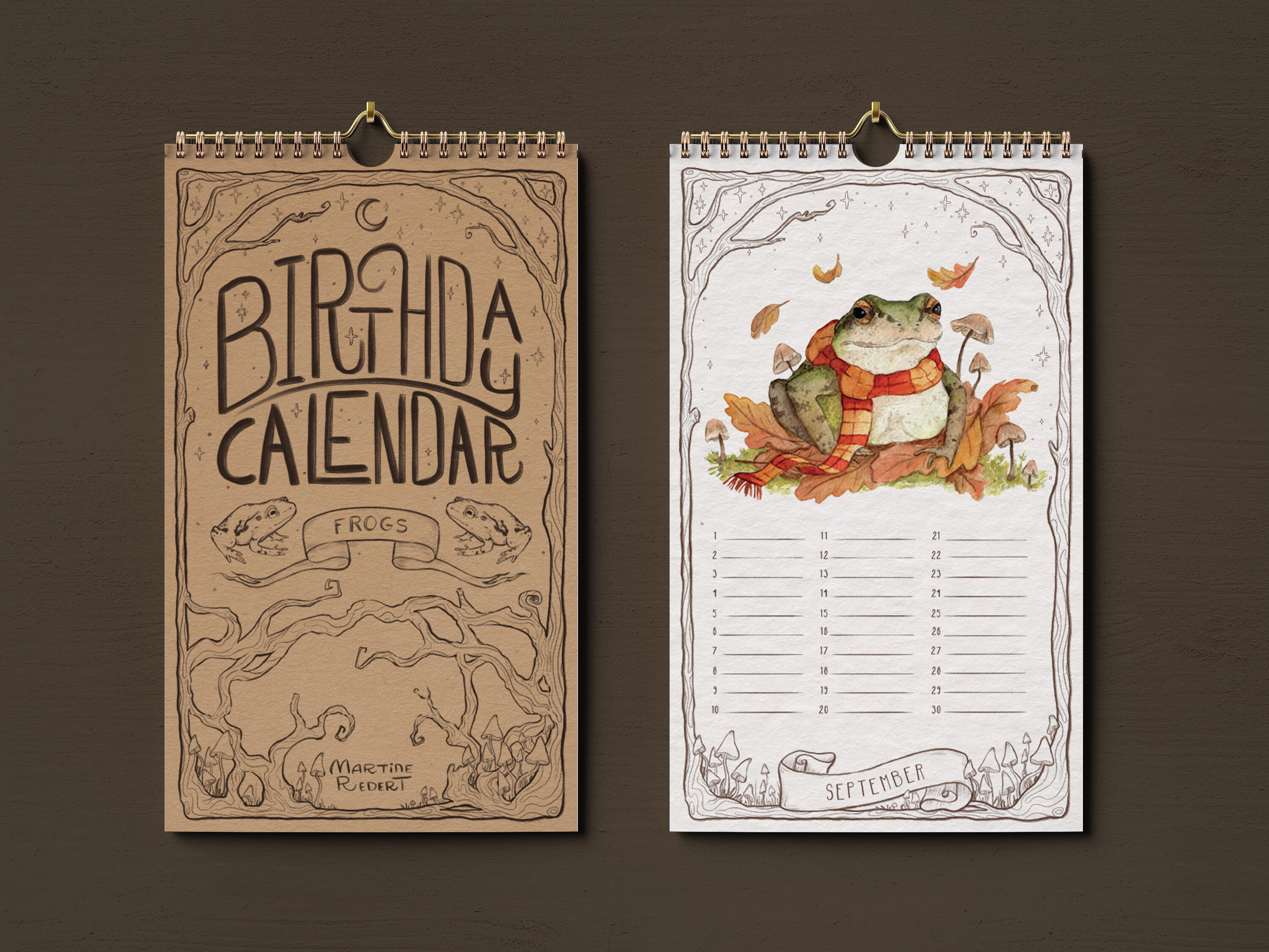 Every single frog has been hand drawn and painted with watercolors and colored pencils. Each month has it's own frog type and theme.Only a limited amount will be printed in premium quality that resembles the watercolor paper the original paintings have been made on.The calendar is 18cm wide and 30cm tall.